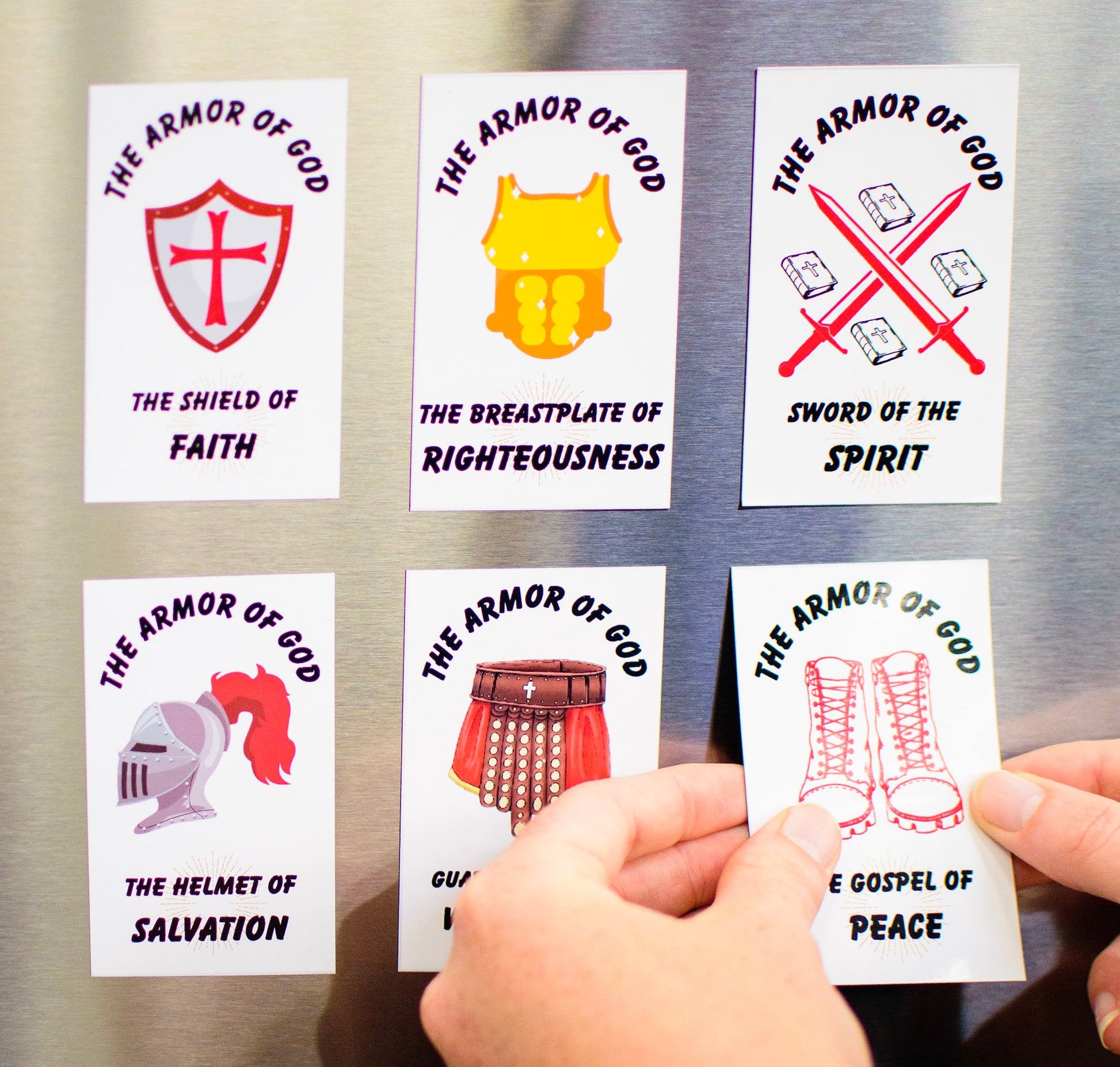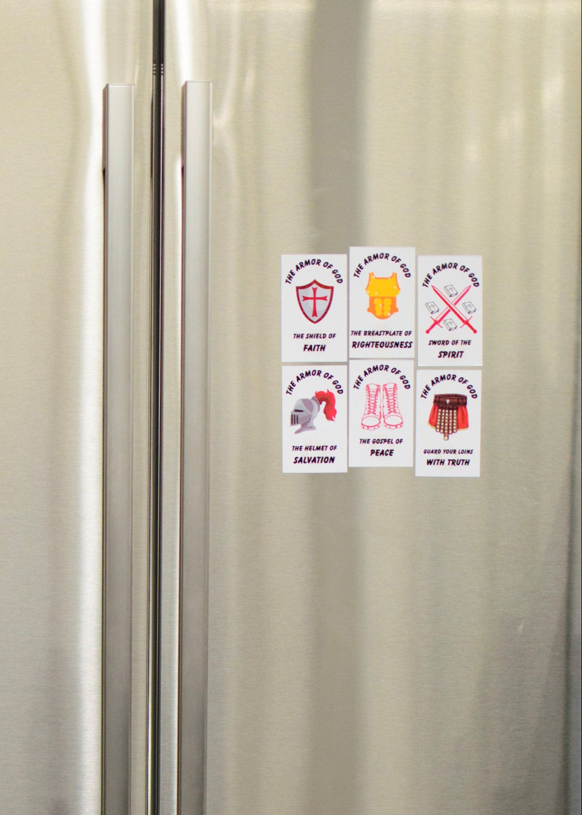 Each set includes 6 unique educational magnets representing: The belt of truth, The Breastplate of righteousness, The Gospel of Peace, The Shield of Faith, Helmet of Salvation and the Sword of the Spirit.